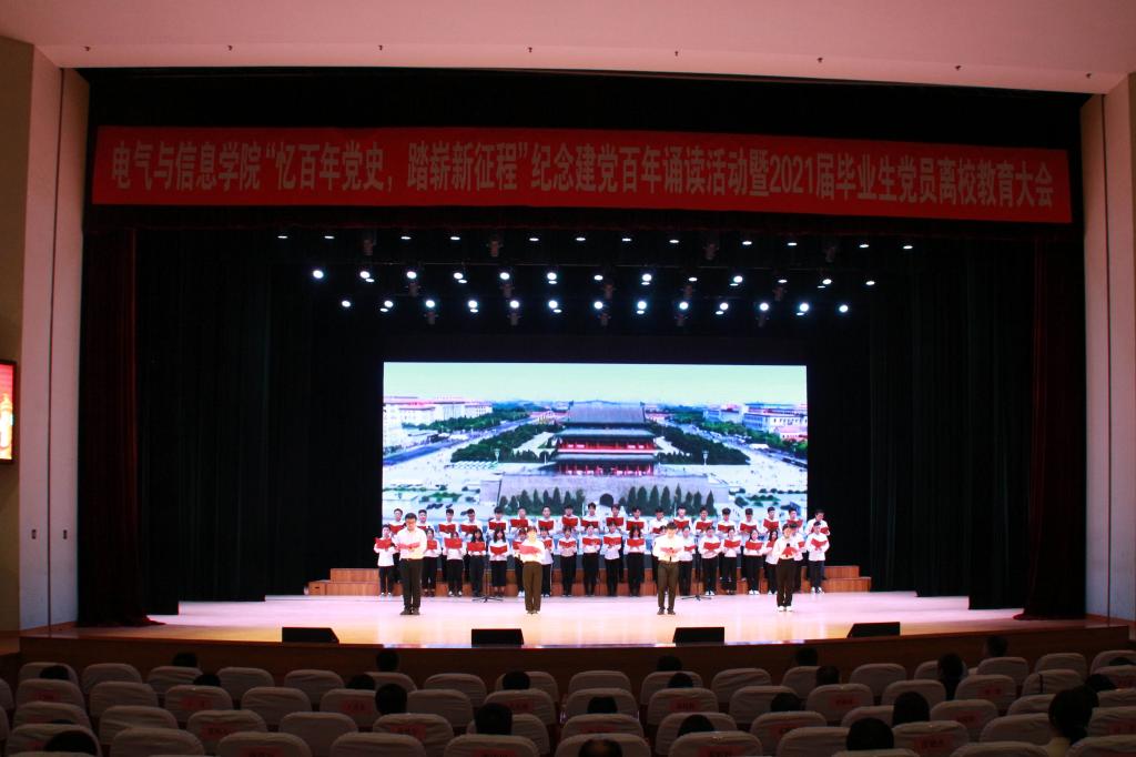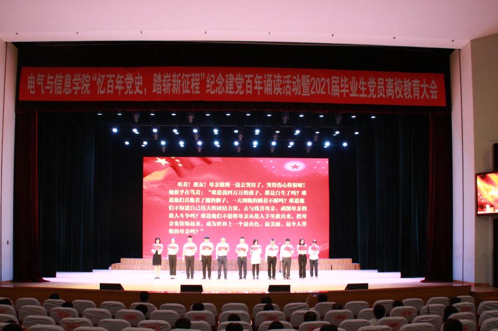 为隆重庆祝中国共产党成立100周年,持续推进党史学习教育走深走实,教育引导学院全体师生员工聚焦中国共产党百年奋斗历程,围绕党史、新中国史、改革开放史、社会主义发展史及新时代中国特色社会主义建设的伟大实践,学史明理、学史增信、学史崇德、学史力行,强化毕业生党员理想信念,牢记使命担当,厚植爱国情怀,脚踏实地开启人生新篇章,6月16日下午,太阳成集团tyc7111在音乐厅举办“忆百年党史,踏崭新征程”庆祝建党100周年诵读活动暨2021届毕业生党员离校教育大会。学生工作处副处长李晓书、校团委副书记高天琦、招生就业处副处长李巍出席活动,太阳成集团tyc7111全体教职工,毕业生党员代表、在校生党员代表、入党积极分子代表及团员代表参加活动。