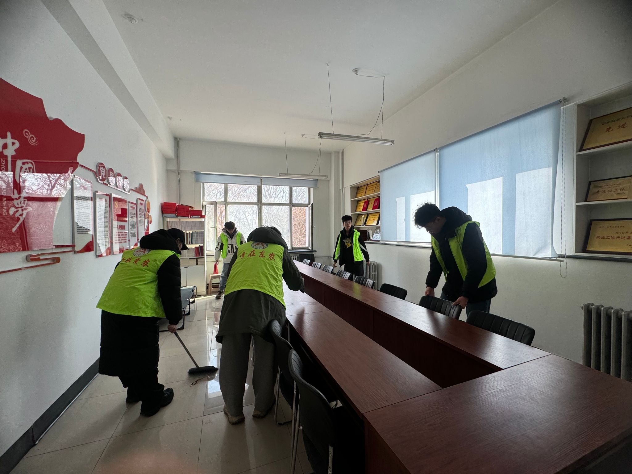 在辅导员陈德宝、牛牧原老师的带领下,学生们分工明确、干劲十足,手持扫帚、抹布等工具,分组对学院教室、学生活动区域展开“地毯式”清理。实验室内,志愿者们仔细擦拭仪器设备、整理实验台线路、清理卫生死角;学生活动区域,同学们手持扫帚、抹布,对门窗、扶手、宣传栏进行全方位清洁;户外区域,志愿者捡拾绿化带垃圾,清理排水沟杂物,并张贴垃圾分类标识,向过往师生普及环保知识。活动中,大家分工协作、干劲十足,展现了电气学子不怕脏累、团结互助的精神风貌。
