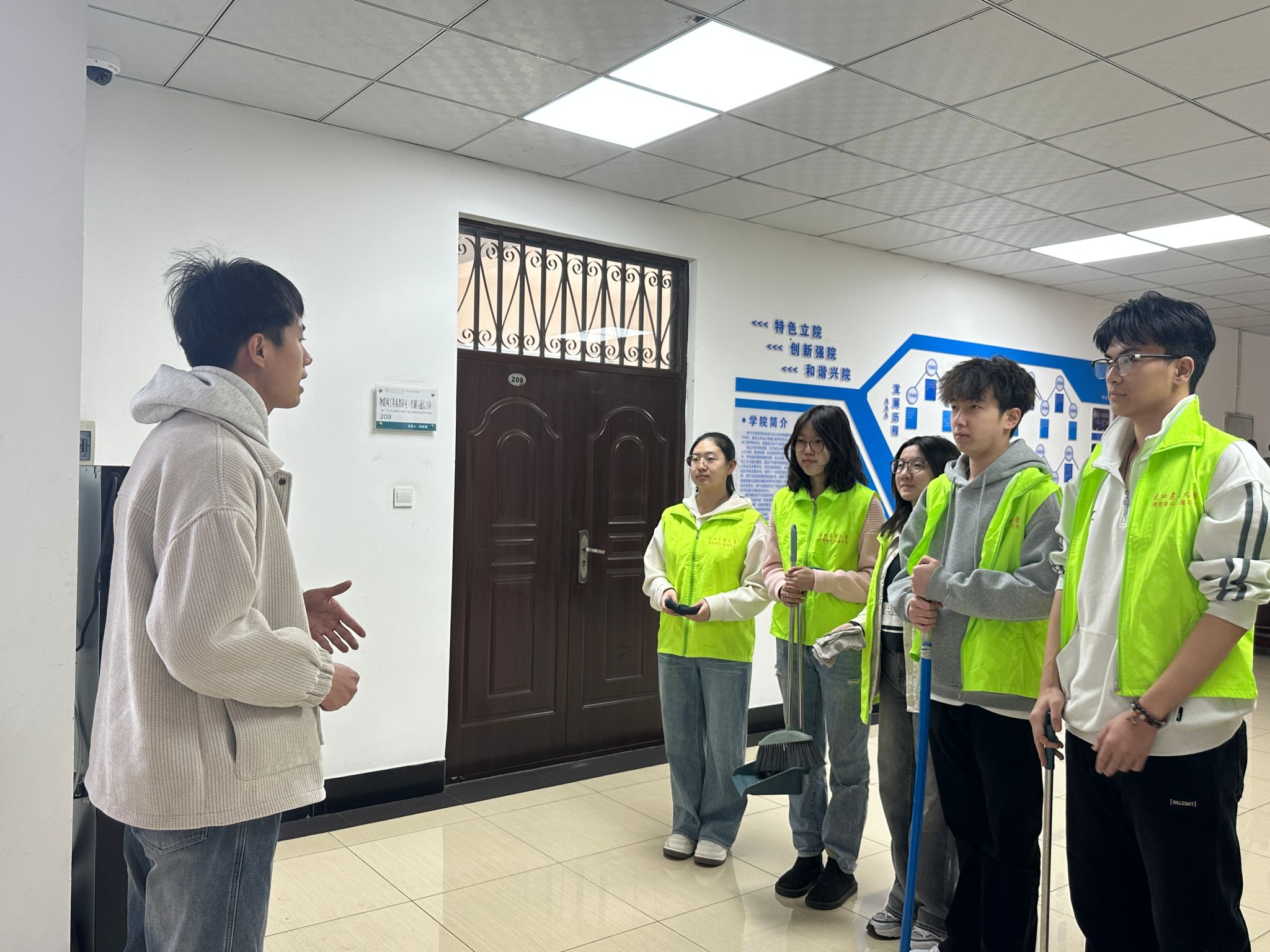 中午13时,学生志愿者们在学院楼前集合,活动负责人、学院2024级辅导员牛牧原老师作动员讲话,强调雷锋精神的核心是“把有限的生命投入到无限的为人民服务中去”,号召同学们以劳动实践传递温暖,用青春力量美化校园。随后,志愿者们分成设备整理组、卫生清洁组、垃圾分类组等六个小组,分区域开展行动。