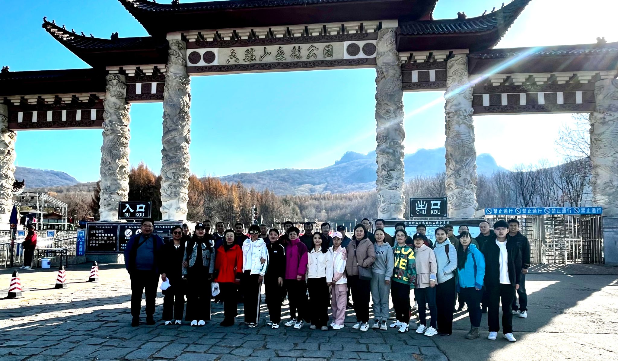 “上山容易,下山难”,下山是对人的膝盖和注意力的考验。但是,在老师们的相互搀扶和帮助下,12点40分,全体教职工顺利、安全下山,并在山门前合影留念。