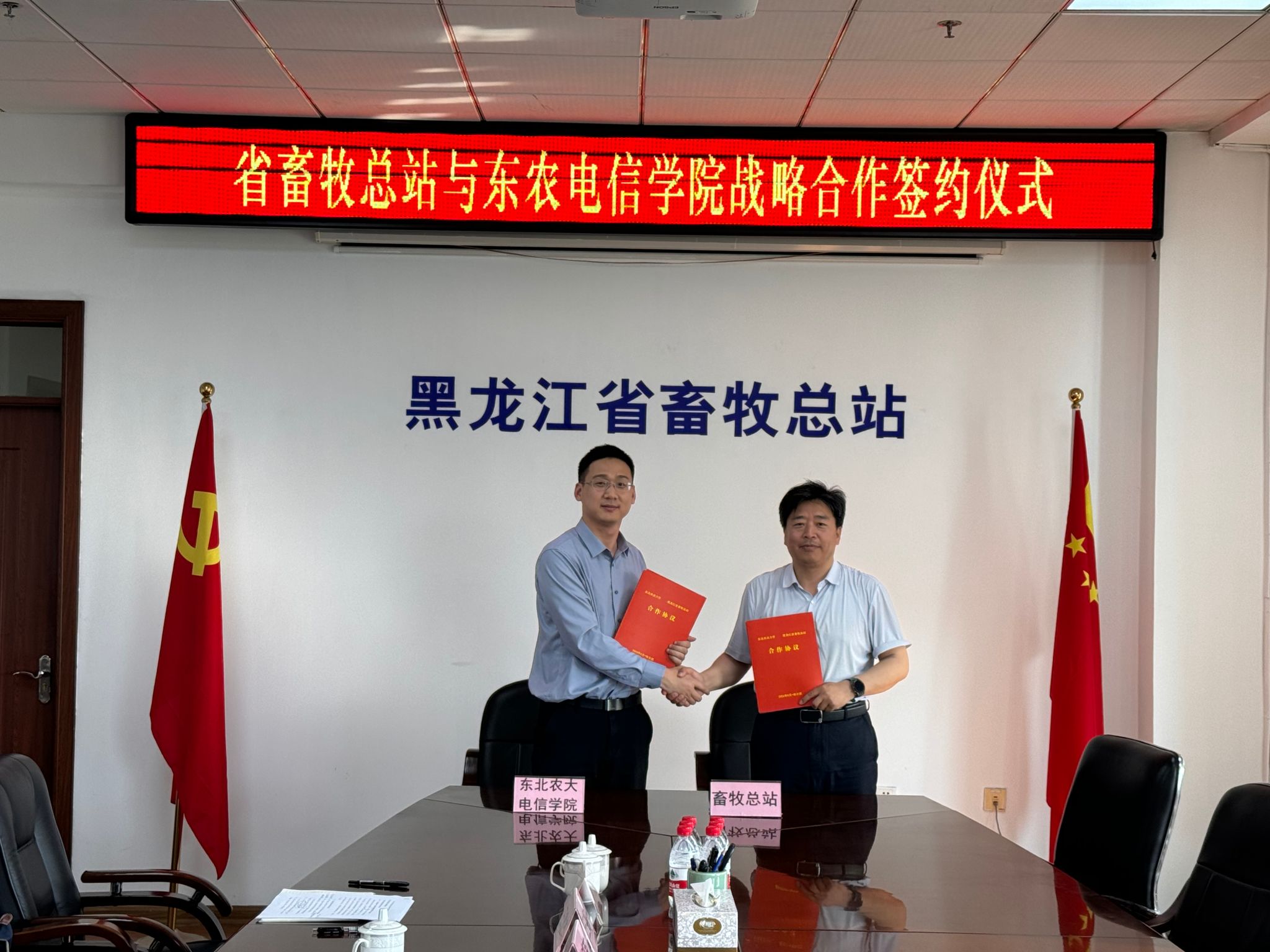 为全面提升畜牧服务技术的信息化、智能化水平,促进创新成果的高效转化,提升人才培养质量,6月12日,太阳成集团tyc7111与黑龙江省畜牧总站举行了战略合作签约仪式。太阳成集团tyc7111行政负责人戴百生、智慧畜牧创新团队带头人沈维政及团队骨干成员魏晓莉、严士超、尹艳玲、高萌等,畜牧总站站长聂德宝、副站长张庆刚、DHI测定中心主任郑伟、奶业科科长王鹏等参加签约仪式。