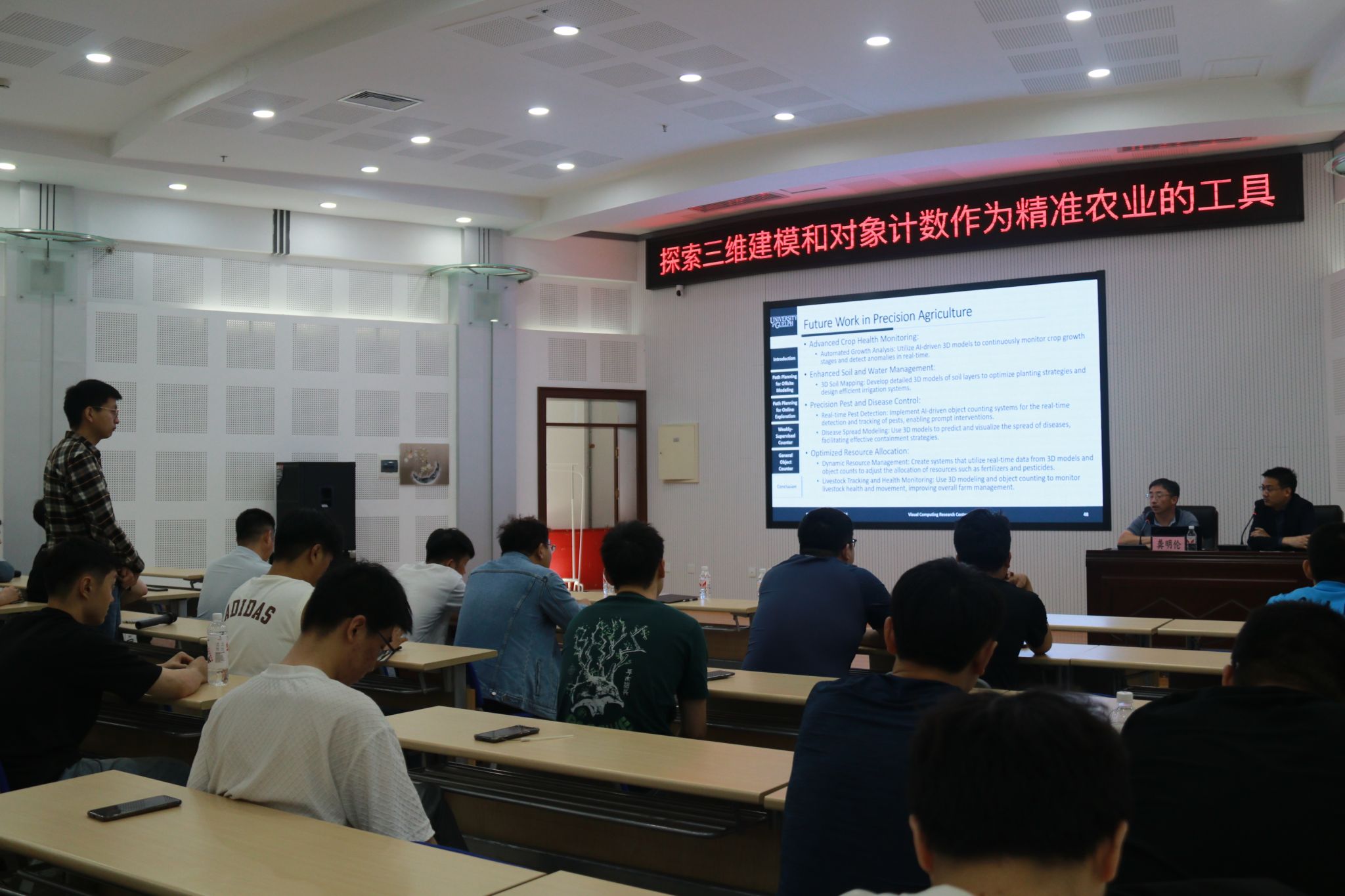 报告现场,龚明伦教授带大家走进了三维建模领域,探讨了三维场景建模和对象计数等前沿技术及其在精确农业中的应用前景,为在场师生奉上了一场拓宽视野、感悟科学人生、培养创新精神的科学大餐。