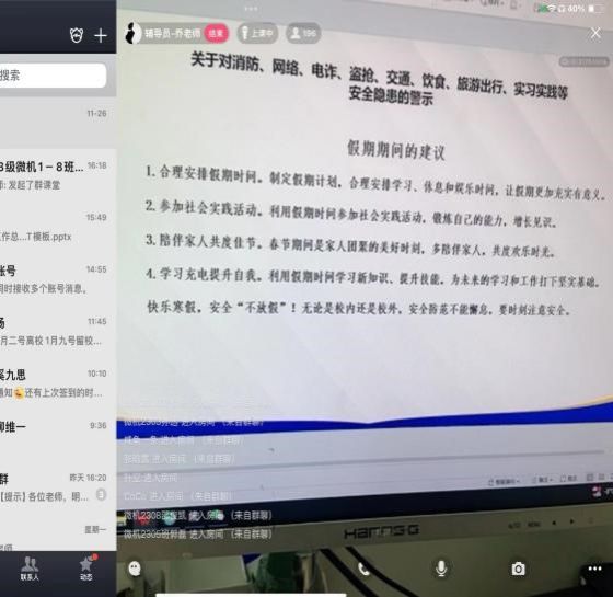 本次系列视频会议,学院十位辅导员老师从假期学业提升、安全教育、社会实践、个人规划、就业指导、留校学生管理等多方面、多角度开展了针对性的交流指导,旨在让学生认识到,假期不止是休息和调整的时间,更是思考与充电的时间,要充分利用好假期,做好个人发展规划,总结成功经验,思考存在的不足与教训,为新学期更好蓄力。各位老师同时预祝全体同学加强愉快,并通过全体同学祝家长朋友们工作顺利、新年快乐。