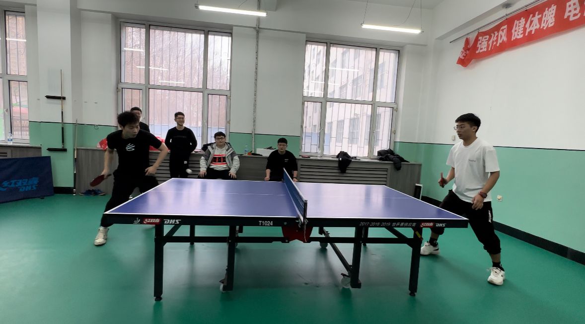 乒乓球赛中,选手们精准挥拍、迅速回击、灵活转体、展现了高超的搏杀技巧,让观赛同学不时发出阵阵喝彩。