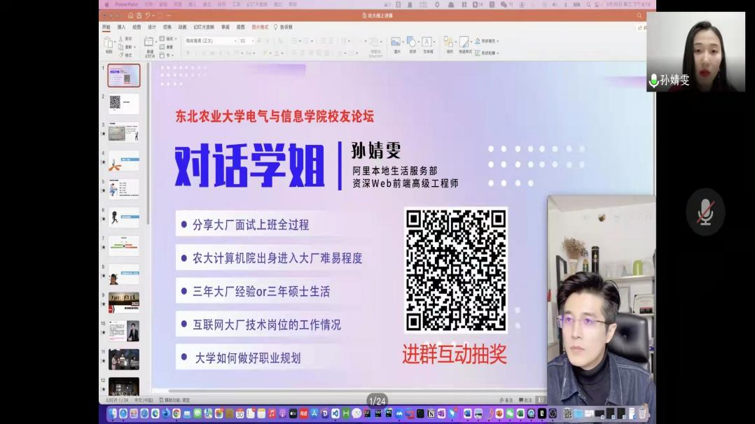 会议以两位嘉宾互动交流的形式展开。交流中,孙婧雯介绍了个人求职经历和其所在企业的发展与变革。她从自身作为阿里本地生活服务平台饿了么商业智能部高级前端工程师的经历,讲述本专业学生在就业过程中应具备哪些素质,从哪些方面进行学习和提升,并分享了在互联网“大厂”中求职就业经验及所经历的工作与生活趣事,以自己的亲身经历,激发同学们的职业憧憬和职业向往。