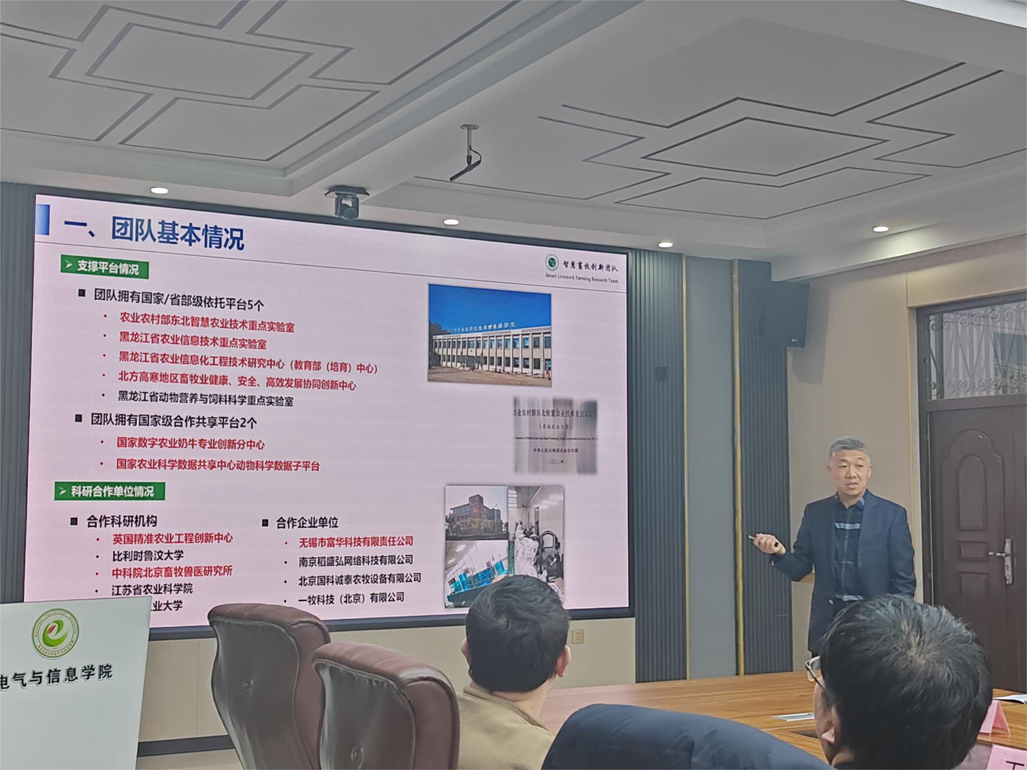 戴百生首先代表学院感谢聂德宝研究员一行来到东北农业大学太阳成集团tyc7111交流指导工作。他介绍了太阳成集团tyc7111的发展历程、师资队伍建设、人才梯队建设及科学团队建设情况。他指出,高校太阳集团工作的开展离不开行业专家高屋建瓴的指导,鼓励智慧畜牧创新团队全体成员要多与畜牧专家展开交流活动,充分吸收奶牛育种专家的一线生产经验和科研经验,找准研究方向,针对性开展研究内容,早日实现现代智能化养殖装备的生产与真正落地、普及。