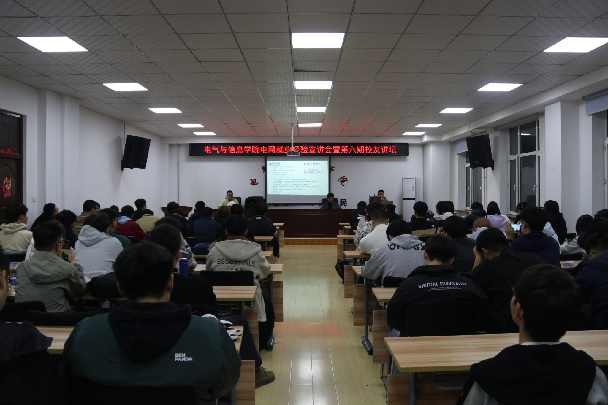 几位校友依次登台,他们以丰富的职业经历和专业素养,为同学们详细介绍了国家电网的工作环境、职业发展路径以及对人才的需求。他们强调了扎实的专业知识、良好的团队协作能力和创新精神在国家电网工作中的重要性,分享了他们在求职过程中的经验和技巧,包括如何准备简历、应对面试等方面,为即将面临就业的同学们提供了极具实用性的建议。