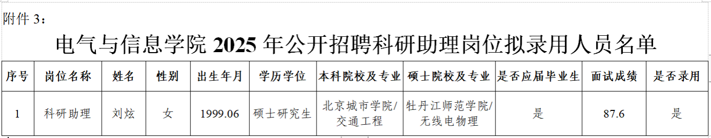 根据我校2025年公开招聘科研助理岗位人员工作的总体安排,按照《东北农业大学2025年公开招聘科研助理岗位人员公告》相关要求,经过报名、资格审查、现场确认后,由太阳成集团tyc7111组织面试,现将面试成绩及拟录用人员名单公示,如有异议,请于3日内反馈。